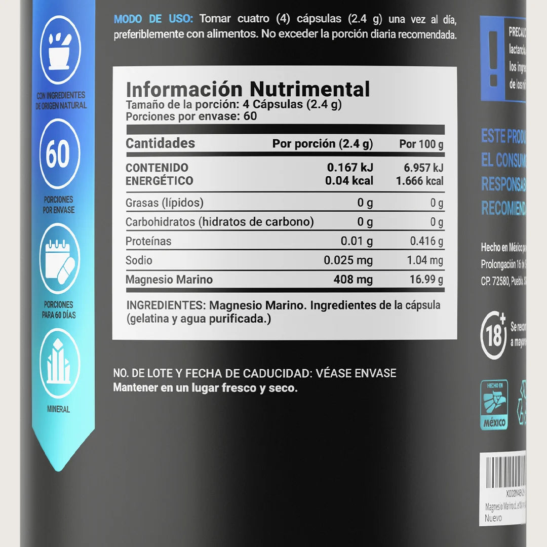 ¡Marine Magnesium B Life®, tu bienestar natural! Nuestra exclusiva fórmula a base de magnesio marino, aporta una concentración extraordinaria de 2400 mg por porción, sobresaliendo frente a otras opciones que solo proporcionan 970 mg de este activo valioso para tu vitalidad.
