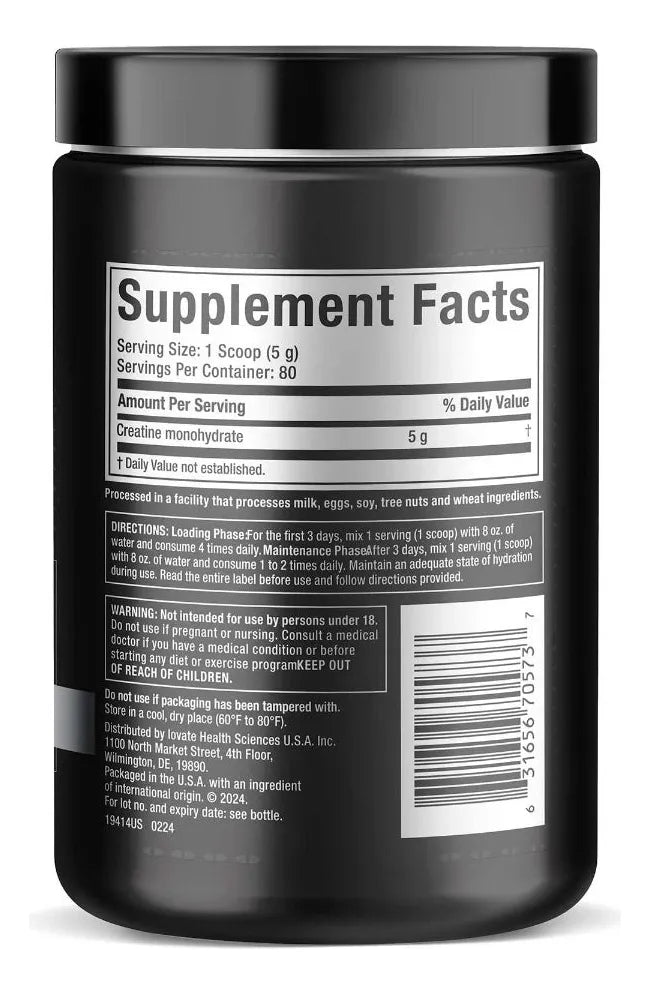 Contiene monohidrato de creatina micronizada, la forma de creatina de mayor absorción y eficacia, que potencia el aumento de la fuerza, la resistencia y el crecimiento muscular. Suministra 5000 mg de creatina pura por dosis. La creatina es el complemento más popular y utilizado entre los atletas para incrementar la fuerza, la potencia y estimular el crecimiento de masa muscular. Esta fórmula proporciona óptimas dosis de la mejor creatina en forma pura.
