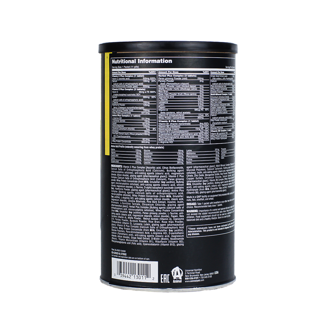 ANIMAL PACK DE LA SERIE ANIMAL DE UNIVERSAL NUTRITION: EL MULTIVITAMINICO Y MULTIMINERAL MÁS POTENTE. La fórmula presenta la mejor reacción sinérgica de sus componentes avanzados para una óptima asimilación y de este modo obtener un excelente rendimiento. Animal Pack debe de considerarse como el suplemento base para cualquier suplementación, y preparación deportiva, y así lo recomiendan los principales preparadores deportivos, a nivel internacional, independientemente de la practica deportiva que se realice (culturismo, deportes de resistencia, deportes colectivos, etc). Animal Pack de Universales un suplemento de gran potencia desarrollado estrictamente para los atletas más avanzados que realizan entrenamientos muy intensos y requieren de un aporte de calorías superior al promedio de la población. Una de las características de Animal Pack es que contiene gran cantidad de proteínas, hasta un 200% más que otro suplemento similar del mercado. Los atletas de fuerza y levantadores de potencia tienen requerimientos muy elevados y sucede con frecuencia que las fórmulas básicas no son suficientes para evitar las deficiencias nutricionales.